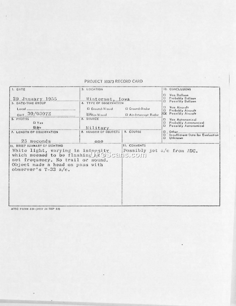 Project 10073 Record Card and Correspondence — Winterset, Iowa, 30 January 1955