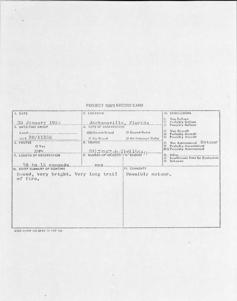 On 30 January 1955, at 1125Z, a sighting of an unidentified aerial object occurred over Jacksonville, Florida. The event was observed by both civilian and military personnel, including an air traffic controller at Imeson Airport and an aerologist at Cecil Naval Air Station. The witnesses described the object as round, very bright, and possessing a very long trail of fire. The object was observed for approximately 10 to 15 seconds as it traveled in a straight downward path before fading from view. Weather conditions at the time were clear, with eight miles of visibility and no cloud cover or thunderstorms. The incident was reported through military channels, including the Flight Service Center at Maxwell Air Force Base, to the Air Technical Intelligence Center and the Air Defense Command. Official documentation, including Project 10073 record cards and an UFOB index card, indicates that the investigation concluded the object was likely a meteor or meteorite. The report notes that the description of the object would indicate a comet or meteorite, and the case was closed with this assessment.