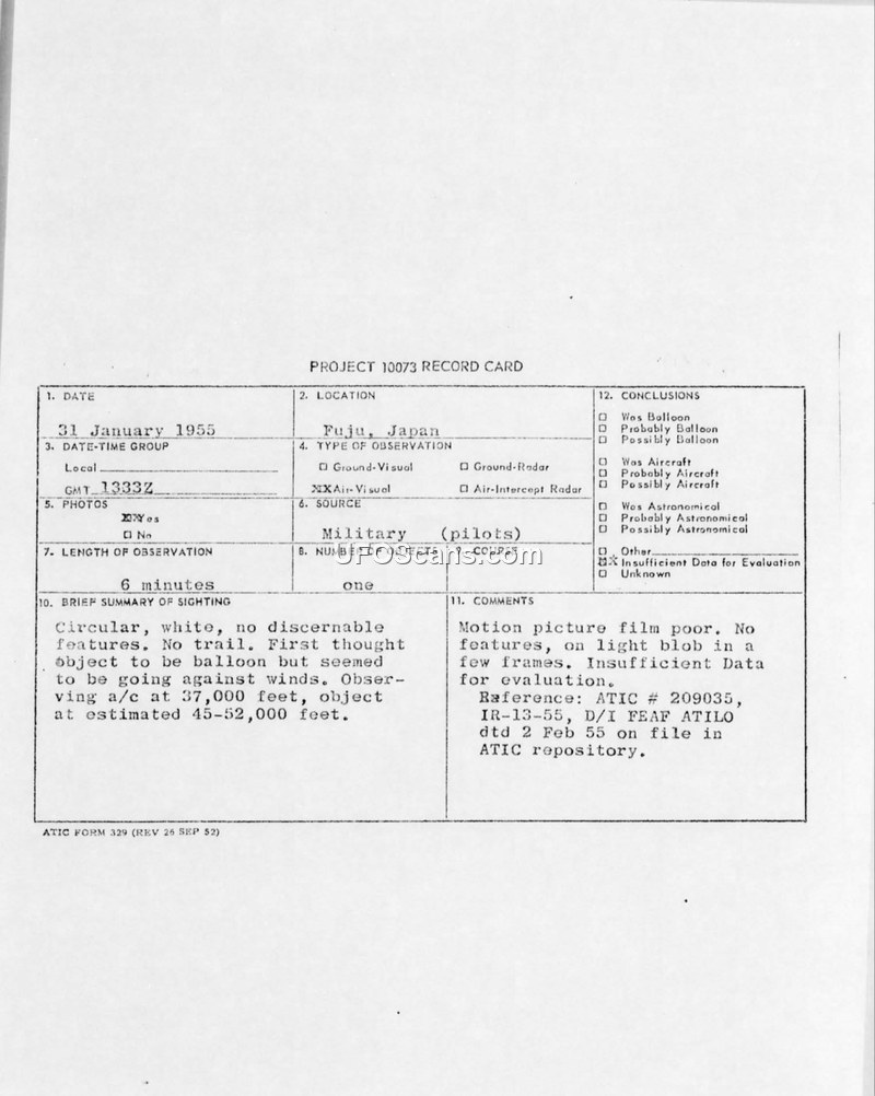 Project 10073 Record Card — Fuju, Japan, 31 January 1955