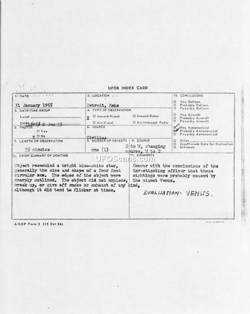 This UFOB Index Card documents a sighting that occurred on 31 January 1955 in Detroit, Michigan. A civilian witness reported observing a single object for a duration of 35 minutes. The object was described as resembling a bright blue-white star, approximately four feet in size, with a circular saw shape and sharp outlines. The witness noted that the object did not explode, break up, or emit any smoke or exhaust, though it did exhibit a tendency to flicker. The object's flight path was reported as moving from East to West, then changing course to move from West to East. The report concludes that the sighting was likely caused by the planet Venus, a finding concurred with by the investigating officer.