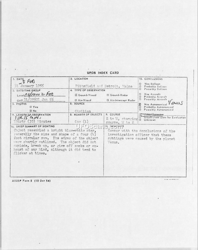 This report documents UAP sightings in Maine in early 1955, which were officially attributed to the planet Venus. It also contains later 1960 correspondence regarding an unrelated, unverified sighting in Alaska.