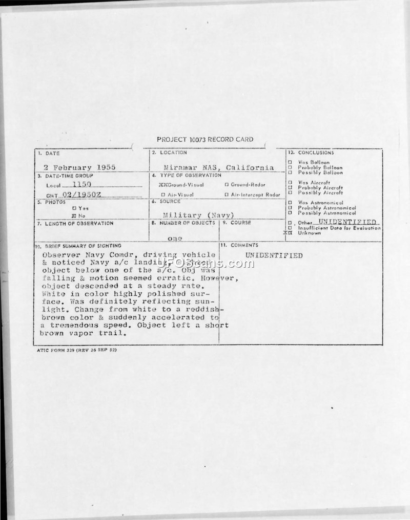 This document collection details the report of an unidentified aerial object sighted on 2 February 1955 at 1150 hours near Miramar Naval Air Station, California. The witness, a Navy Commander with 26 years of experience in Naval Aviation, was driving a vehicle when he observed the object. Initially, he noticed two FJ3 aircraft in the landing pattern. He then spotted a third object below one of the aircraft, which he initially thought might be an ejected canopy. However, the object's behavior—descending at a steady rate, then coming to a complete stand-still for 5 to 10 seconds, and finally accelerating to a speed estimated between 1000 and 1500 miles per hour—convinced him it was not a part of an airplane. The witness described the object as spherical or near-spherical, off-white in color with a highly polished surface that reflected sunlight. It left a short brown vapor trail. The witness estimated the object's size to be between 25 and 35 feet in diameter, though he noted it could conceivably have been 100 feet. He explicitly stated that the object was not an aircraft in the normal sense, nor was it a reflection or an optical illusion. The report was processed through the Office of Naval Intelligence and forwarded to the Air Technical Intelligence Center at Wright-Patterson Air Force Base. Multiple military offices, including the 13th District Office of Special Investigations and the Eleventh Naval District, handled the documentation. The Air Technical Intelligence Center requested that the witness complete a formal U.S. Air Force Technical Information Sheet to facilitate further analysis, though the witness had already provided a comprehensive narrative report. The final conclusion recorded on the Project 10073 record card is 'UNIDENTIFIED'.