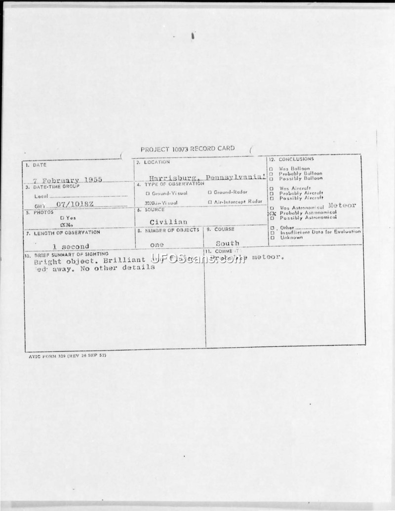 Project 10073 Record Card - Harrisburg, Pennsylvania - 7 February 1955