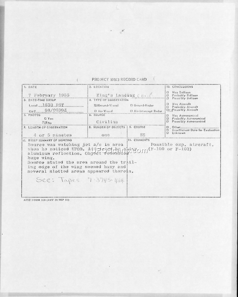 This document collection details a persistent, multi-year effort by a civilian witness, a former Army pilot and electronics technician, to report a UFO sighting that occurred on February 7, 1955, near Knights Landing, California. The witness, who provided detailed sketches and audio tapes, described a large, metallic, wing-shaped object that exhibited performance characteristics far exceeding known aircraft of the era, including vertical climbs and speeds exceeding 2000 mph. The witness believed the object was either from outer space or a prototype Russian nuclear-powered aircraft. The Air Force, through the Air Technical Intelligence Center (ATIC), consistently evaluated the sighting as an experimental aircraft, specifically suggesting it was an F-100 or F-102. The correspondence reveals a growing tension between the witness and the Air Force. The witness, feeling ignored and harassed, sought the assistance of his Congressman, John C. Watts, to force an investigation. The Air Force internal communications characterize the witness as a 'frustrated ex-G.I.' and express annoyance at his persistent demands for a personal interview. Despite the witness's professional background in electronics and missile testing, the Air Force maintained that the case was closed and that no further investigation was warranted. The documents include internal memoranda, letters to and from Congressman Watts, and transcripts of the witness's audio tapes, which also touch upon his personal grievances regarding his employment history and his belief that he was being monitored by security forces due to his knowledge of sensitive information. The final assessments from the Air Force reiterate that the sighting provided no evidence of a national threat and that the original evaluation of an experimental aircraft remained firm.