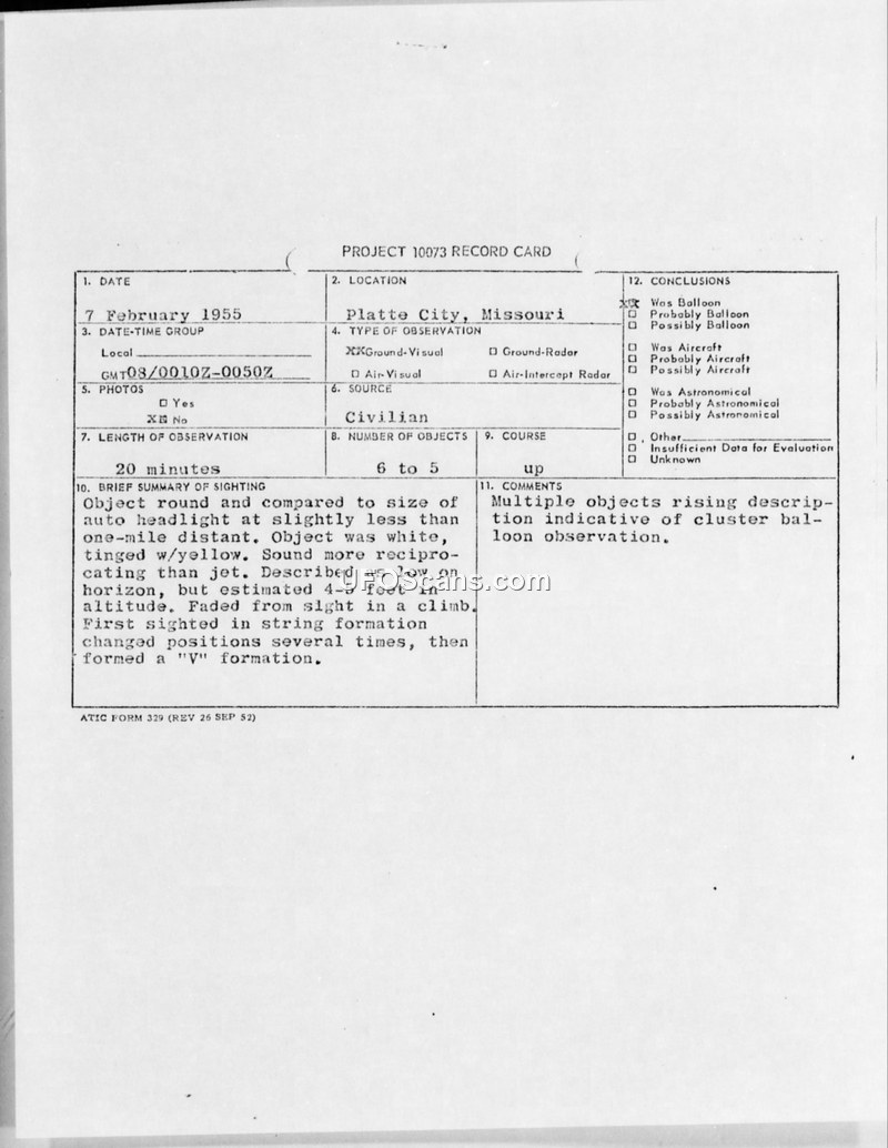 Project 10073 Record Card — Platte City, Missouri, 7 February 1955