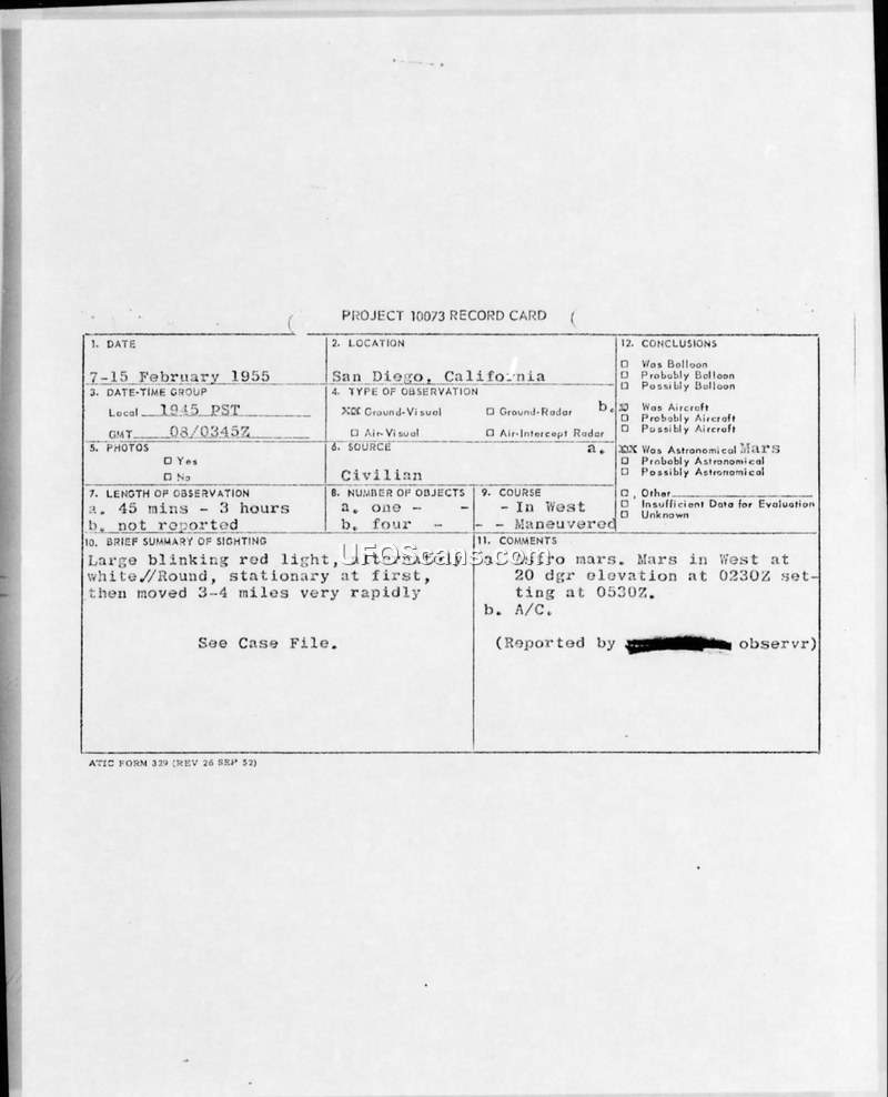Project 10073 Record Cards and Air Intelligence Information Report — San Diego, California, February 1955