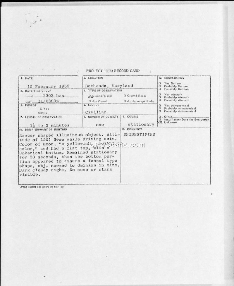 Unidentified Flying Object Observed in Vicinity of Bethesda, Maryland on 10 February 1955