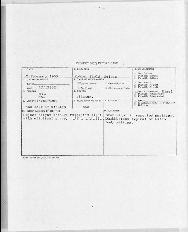 A sighting of an unidentified object at Kobler Field, Saipan, on February 12, 1955, was investigated by the military. The object was officially identified as the star Rigel.