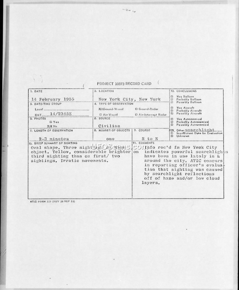 Military intelligence investigated UFO reports in New York City in February 1955, concluding that the sightings were caused by searchlight reflections on clouds and haze.