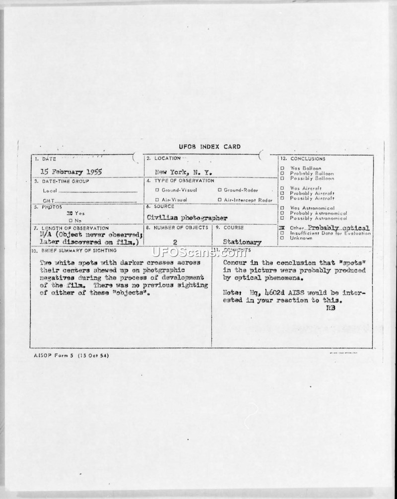 A photographer discovered two unexplained white spots on a film negative taken in Central Park in 1955. Intelligence investigators concluded the spots were likely caused by optical phenomena within the camera.