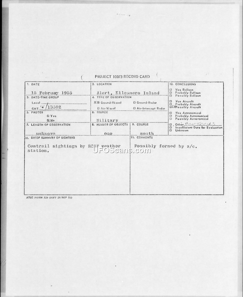 On February 15, 1955, three RCAF weather observers at Alert, Ellesmere Island, reported a contrail-like object. Military authorities investigated and concluded it was a contrail from an aircraft of unknown nationality.