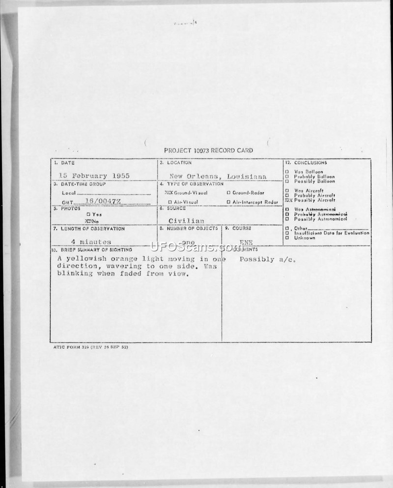 Project 10073 Record Card and Air Intelligence Information Report — New Orleans, Louisiana, 15 February 1955