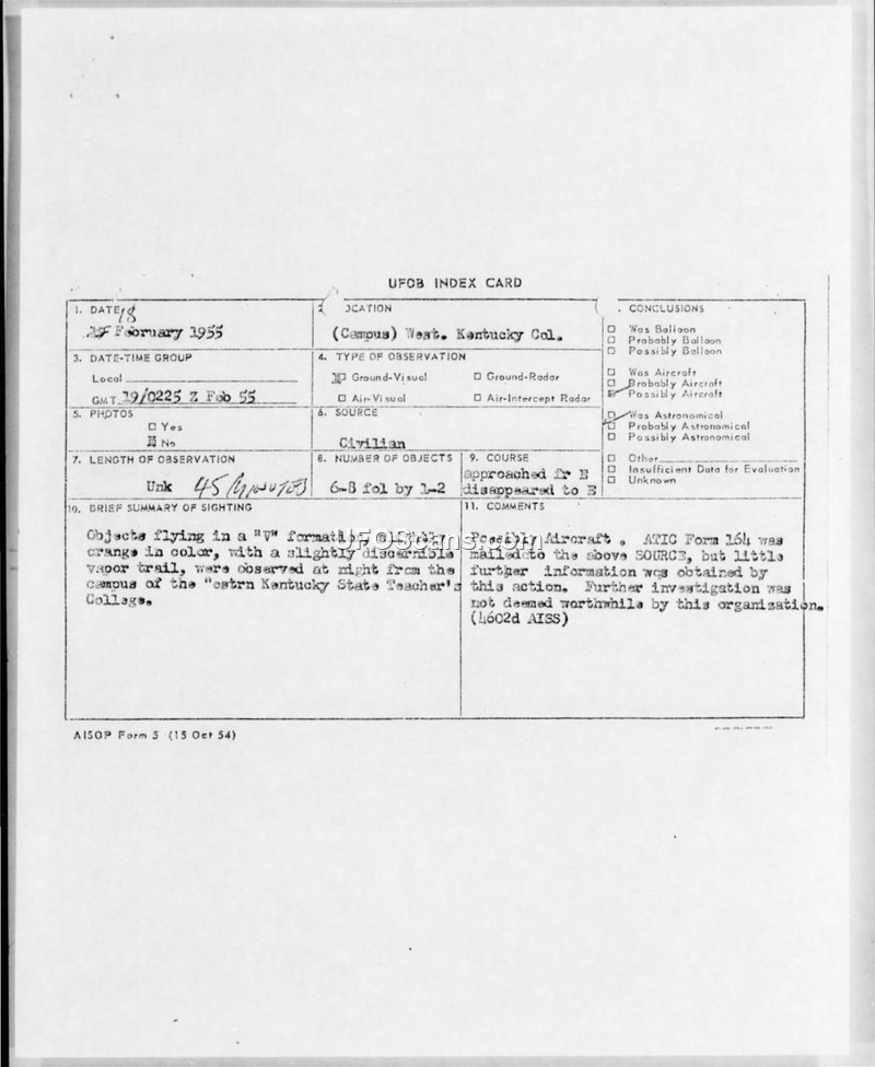 Two students observed 6-8 glowing, orange, silent objects performing complex maneuvers over Western State College in Kentucky on February 18, 1955. The Air Force's 4602d AISS concluded the objects were 'possibly aircraft' but deemed the case unworthy of further investigation.