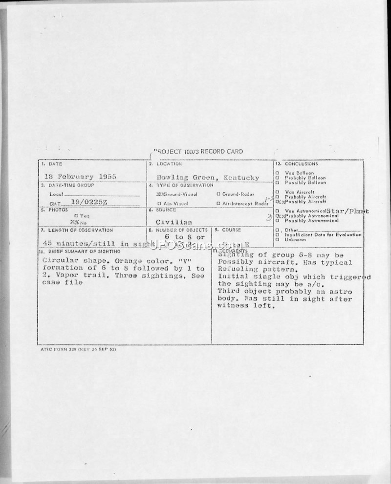 Project 10073 Record Card — Bowling Green, Kentucky, 18 February 1955