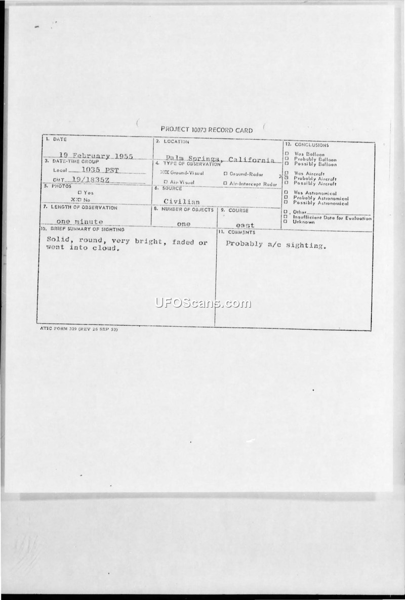 This document contains Project 10073 record cards for February 1955 UAP sightings in Palm Springs, California, alongside various press clippings of contemporary aerial phenomena reports. The sightings range from unidentified objects to meteors and industrial waste.
