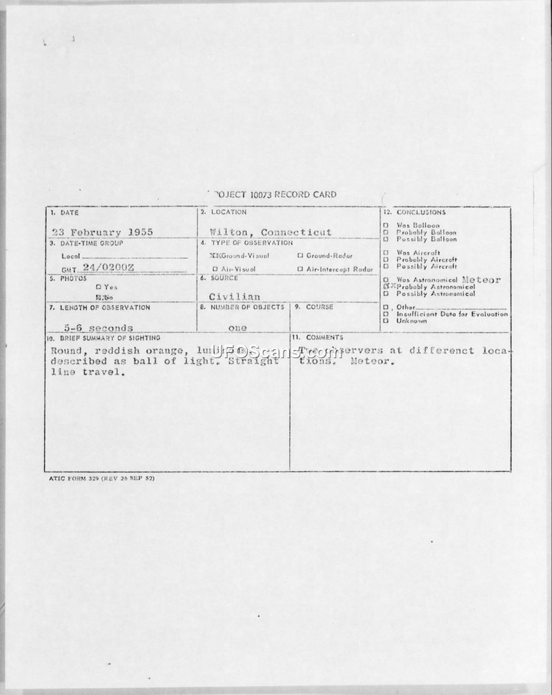 Project 10073 Record Card: Sighting of 23 February 1955, Wilton, Connecticut