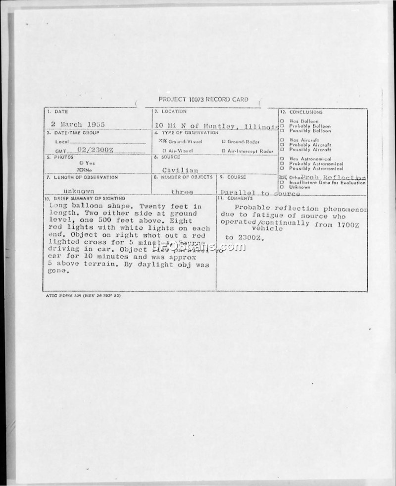 Project 10073 Record Card — 2 March 1955, Huntley, Illinois