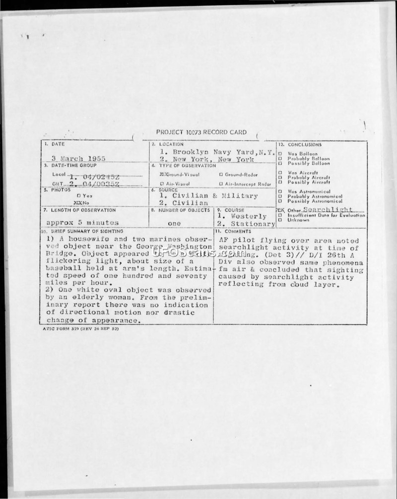 This document consists of a series of military teletype messages and a Project 10073 record card documenting UFO sightings reported in New York City on March 3, 1955. The reports describe two distinct but related observations. In the first instance, a housewife and two Marines observed a white, flickering, oval-shaped object near the George Washington Bridge. The object was estimated to be the size of a baseball held at arm's length and appeared to move at approximately 170 miles per hour. A second report, involving an observer named Erma Wienert, described an egg-shaped white object, ten inches in diameter, observed over the Hudson River vicinity near the George Washington Bridge. The military investigation, coordinated through CONTHREE and the 26th Air Division, involved cross-referencing these reports with observations from an Air Force pilot. The official conclusion reached by the Air Technical Intelligence Center (ATIC) was that the sightings were not anomalous, but rather the result of searchlight activity reflecting off a cloud layer in the area. The documentation includes the original teletype communications between military commands, including CONAD and Wright-Patterson Air Force Base, and the standardized record card used for tracking these incidents under Project 10073.
