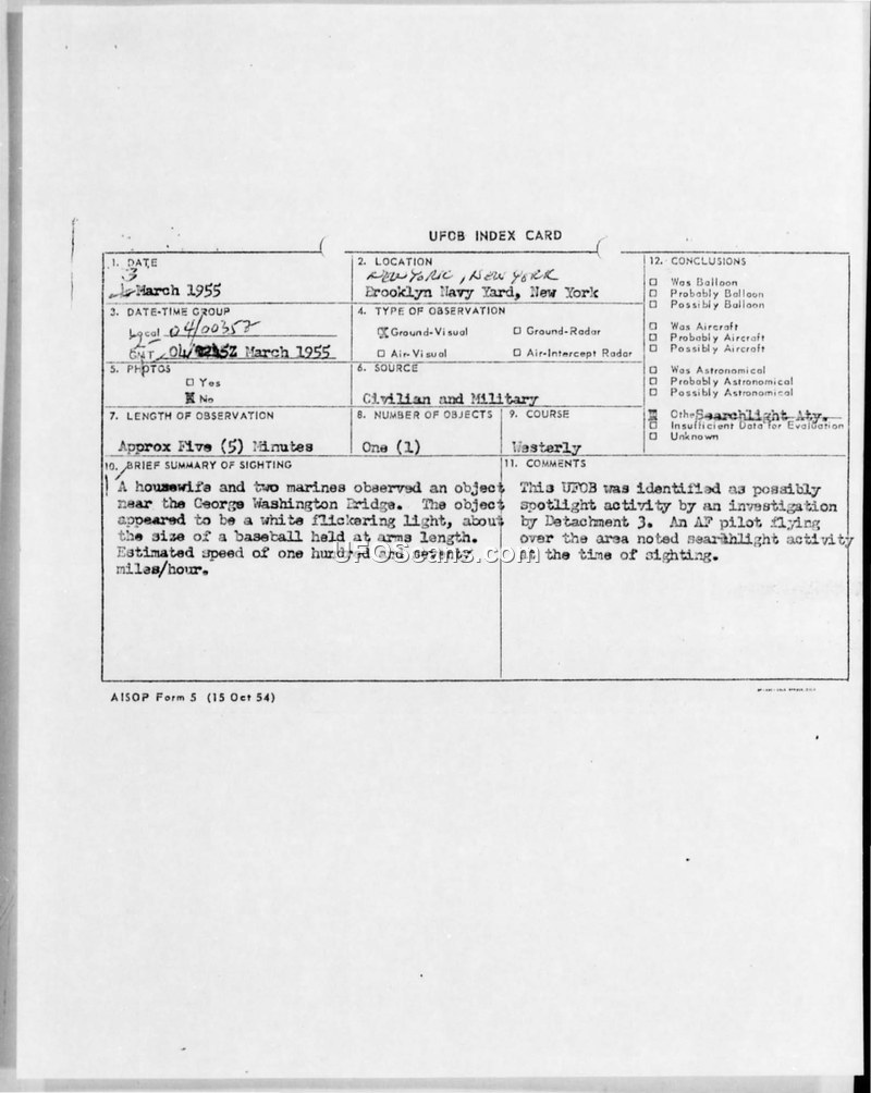 UFO Index Card — March 1955 Sighting, Brooklyn Navy Yard