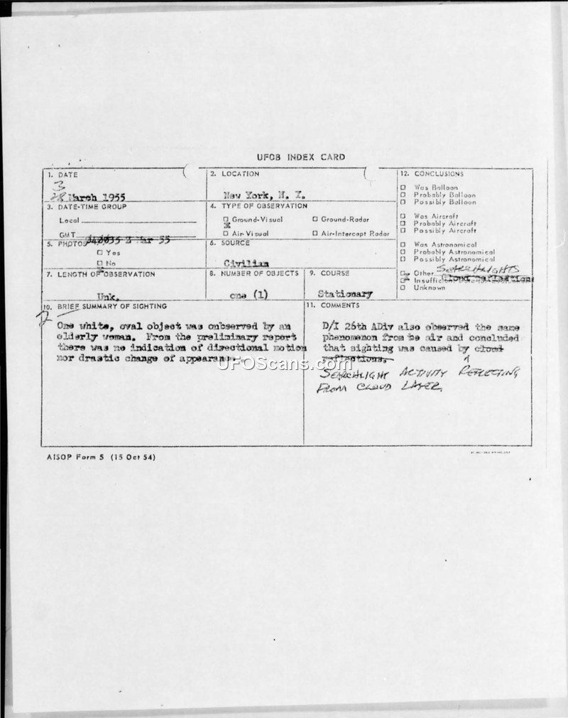 We took particular note of search light activity and related it to probable stimulation of UFO reports. I have no doubt that the objects observed were the result of search light activity on low hanging clouds or smoke haze.