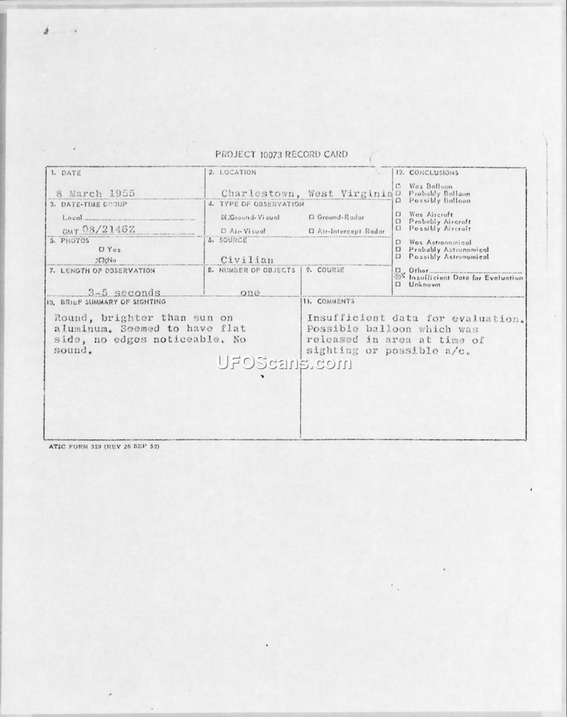 Project 10073 Record Card — Charleston, West Virginia, 8 March 1955