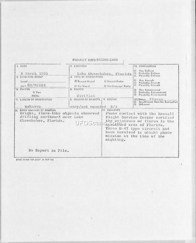 A 1955 sighting of bright, flare-like objects over Lake Okeechobee, Florida, was officially identified as flares. The identification was supported by confirmation from the Maxwell Flight Service Center and the presence of B-47 aircraft conducting a photo mission in the area.
