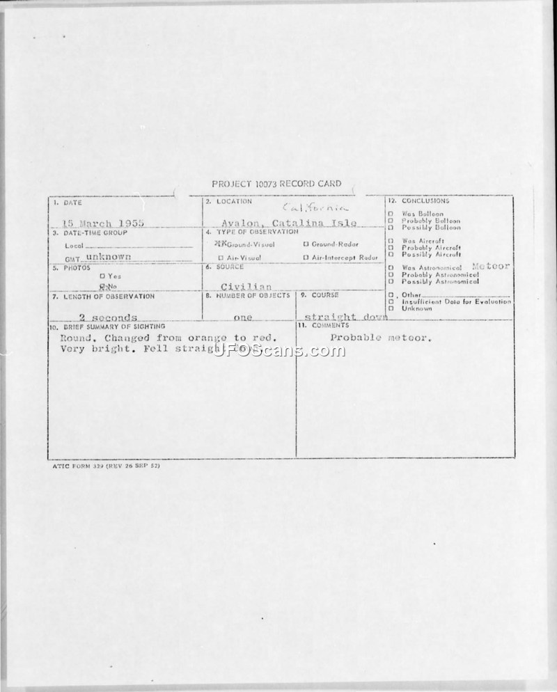 This document is a Project 10073 record card detailing a sighting that occurred on March 15, 1955, in Avalon, Catalina Isle, California. The report, provided by a civilian source, describes a single, round, and very bright object. According to the witness, the object changed color from orange to red and fell in a straight downward trajectory. The duration of the observation was reported as two seconds. The record indicates that no photographs were taken and there was no radar contact associated with the event. The official conclusion recorded on the card is that the object was a 'Probable meteor.'