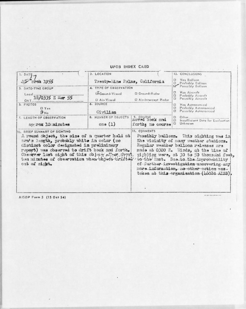 A civilian reported a round, white object drifting in the sky over Twenty-Nine Palms, California, on March 18, 1955. The 4602d AISS concluded the object was likely a weather balloon and closed the case without further investigation.