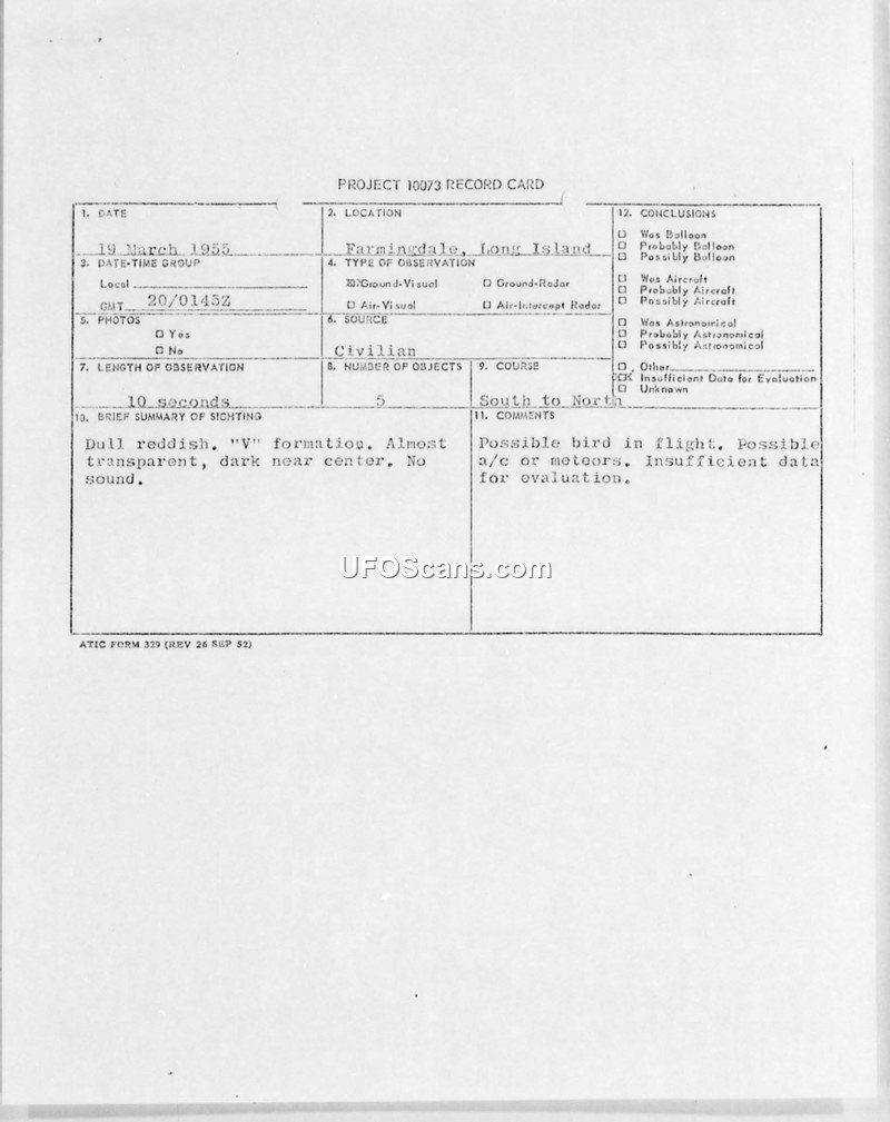 A civilian witness reported five reddish, V-shaped objects over Farmingdale, Long Island, on 19 March 1955. Military intelligence concluded there was insufficient data to identify the objects, despite the witness's assertion that they were not meteors.