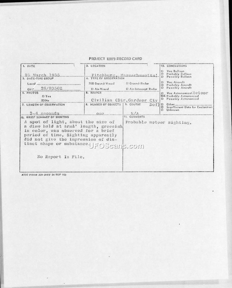 This document is a Project 10073 record card detailing a sighting that occurred in Fitchburg, Massachusetts, on March 25, 1955. The sighting, reported by a civilian named Gardner, involved a single object described as a spot of light, greenish in color, and approximately the size of a dime held at arm's length. The observation lasted for a brief period of three to four seconds. According to the report, the object did not exhibit a distinct shape or substance. The official conclusion reached in the record card is that the event was a probable meteor sighting. The document notes that there is no further report on file regarding this incident.