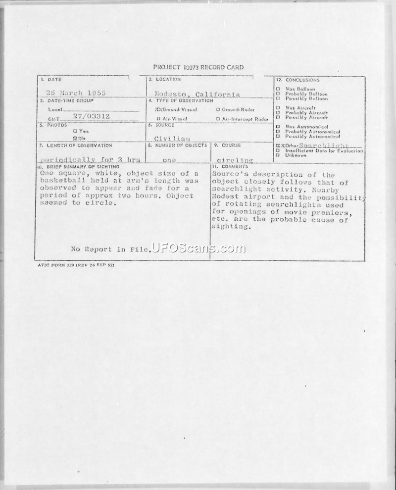 This document is a Project 10073 record card detailing a sighting that occurred on March 26, 1955, in Modesto, California. The witness reported observing a single, square, white object that appeared to be the size of a basketball held at arm's length. The object was observed periodically over a duration of two hours and was noted to be circling. The official evaluation concluded that the sighting was likely caused by searchlight activity, noting the proximity of the Modesto airport and the common use of rotating searchlights for events such as movie premieres. The record card explicitly states that there was no further report in the file.