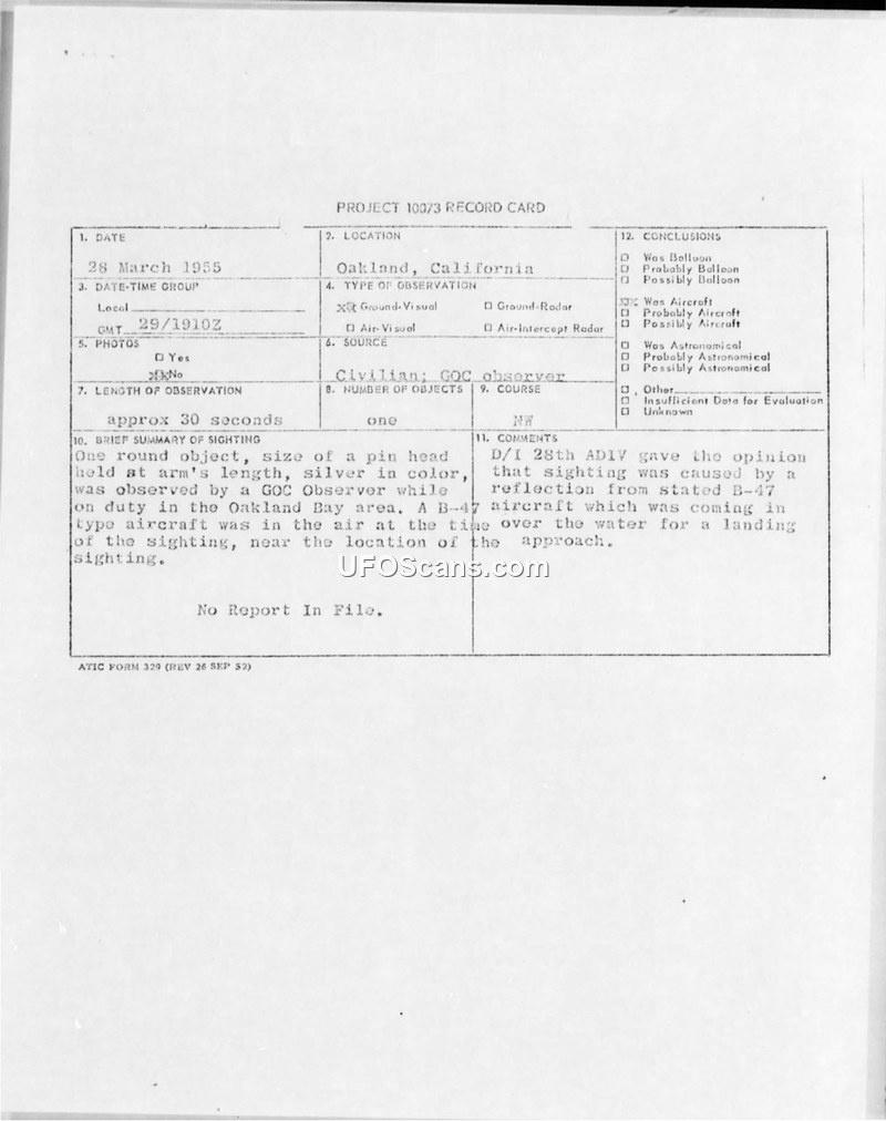 A GOC observer reported a silver, round object in Oakland on 28 March 1955. The 28th ADIV concluded the object was a reflection from a B-47 aircraft.