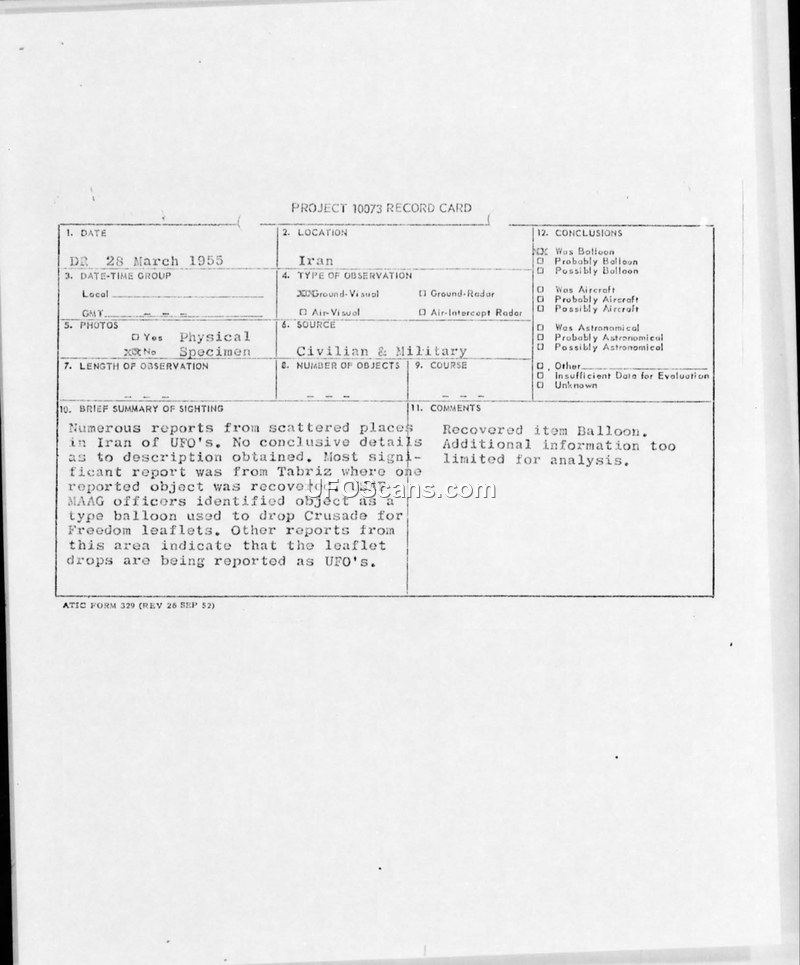 This record card documents the investigation into multiple UFO sightings in Iran in March 1955. The sightings were officially attributed to the recovery of balloons used for the 'Crusade for Freedom' leaflet campaign.