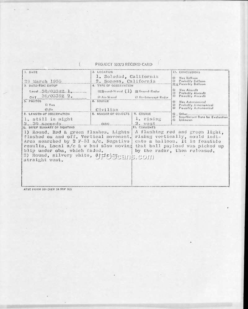 Project 10073 Record Card — Soledad, California, 29 March 1955