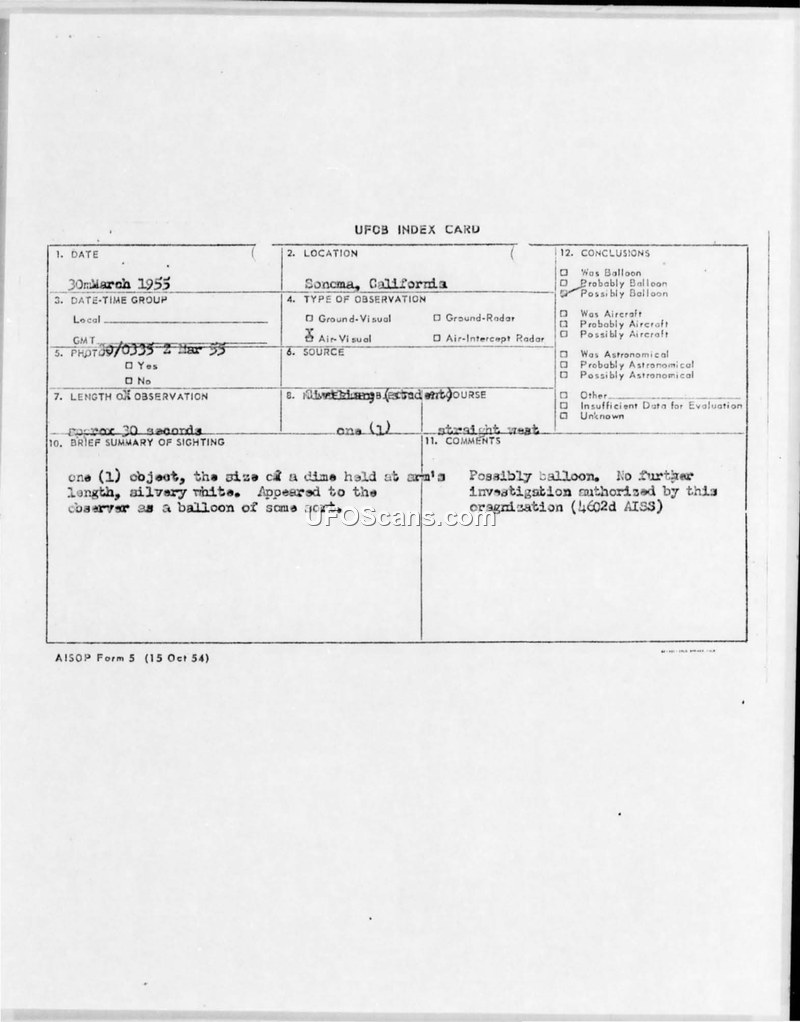 A sighting of a single silvery-white object in Sonoma, California, on March 30, 1955, was evaluated by the 4602d AISS. The organization concluded the object was likely a balloon and authorized no further investigation.