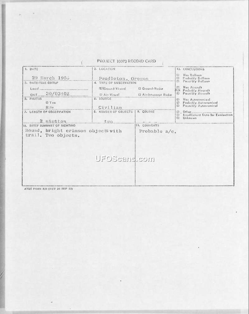 Project 10073 Record Card — Pendleton, Oregon, 29 March 1955