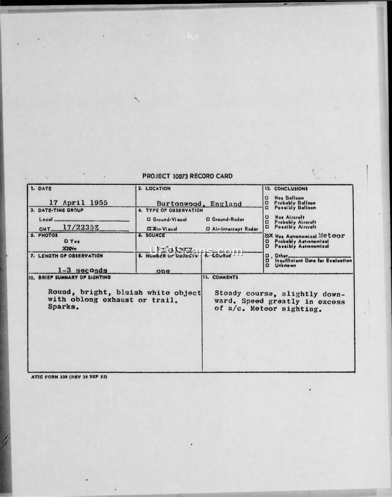 Project 10073 Record Card — Burtonwood, England, 17 April 1955