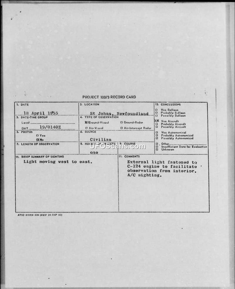 Project 10073 Record Card — St. Johns, Newfoundland, 18 April 1955