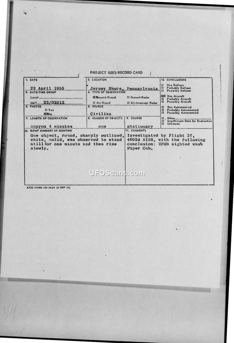 Project 10073 Record Card — Jersey Shore, Pennsylvania, 22 April 1955