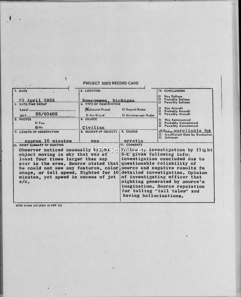 Project 10073 Record Card — Roscommon, Michigan, 25 April 1955