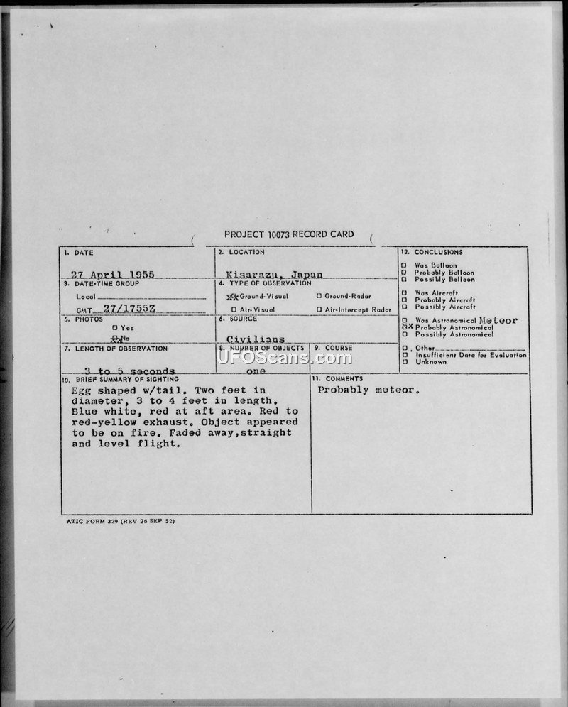 Three civilian guards in Kisarazu, Japan, reported a burning, egg-shaped object with a tail on 27 April 1955. The military investigation concluded the object was likely a meteor.