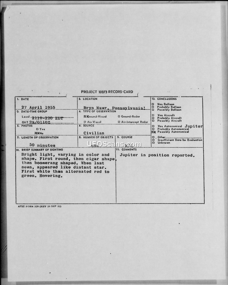 This document comprises a Project 10073 record card and associated intelligence reports regarding a sighting of an unidentified flying object on the night of 27 April 1955 in Philadelphia, Pennsylvania. The witness, a member of the Ground Observer Corps and an administrative clerk at the Philco Corporation, observed the object for approximately 50 minutes while on duty at the Bryn Mawr Hospital. The witness described the object as a bright light that changed shape from round to cigar-shaped and then to a boomerang shape. He noted that the object appeared to hover and pivot, and at one point, he believed he saw a ray of light shoot out from it. The object's color shifted between white, red, and green. The witness reported the sighting to the Trenton Filter Center, though other posts in the area were unable to confirm the observation. The Air Force conducted an investigation, interviewing the witness on 28 April 1955. Meteorological data provided by the U.S. Weather Bureau was also collected. The official conclusion reached by the Air Technical Intelligence Center was that the object was the planet Jupiter, which was in the reported position at the time of the sighting. The report notes that no further investigation was deemed necessary by the 5th District Office of Special Investigations, and the case was closed under the provisions of Air Force regulations.