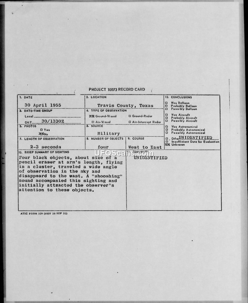 A qualified intelligence officer observed four unidentified black objects in Texas on 30 April 1955. The case was classified as 'UNIDENTIFIED' but was not investigated due to reporting delays.