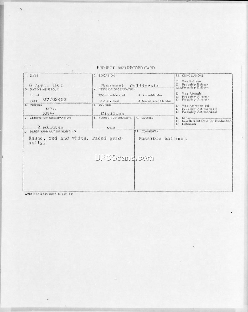 Project 10073 Record Card — Beaumont, California, 6 April 1955