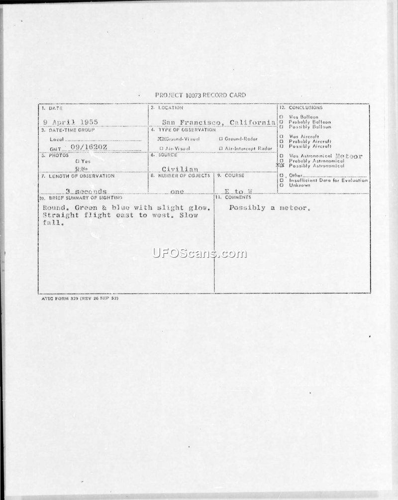 Project 10073 Record Card — San Francisco, California, 9 April 1955