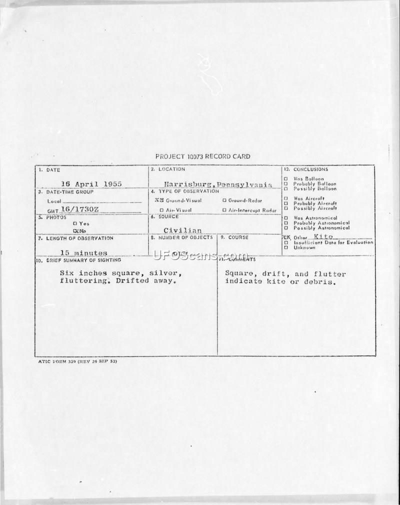 Project 10073 Record Card — Harrisburg, Pennsylvania, 16 April 1955