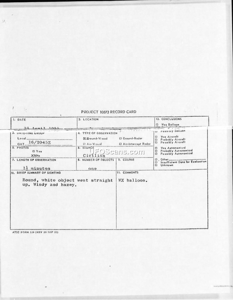 A 17-year-old student reported a round, white object moving vertically in Los Angeles on April 16, 1955. The Air Technical Intelligence Center concluded the object was a weather balloon.