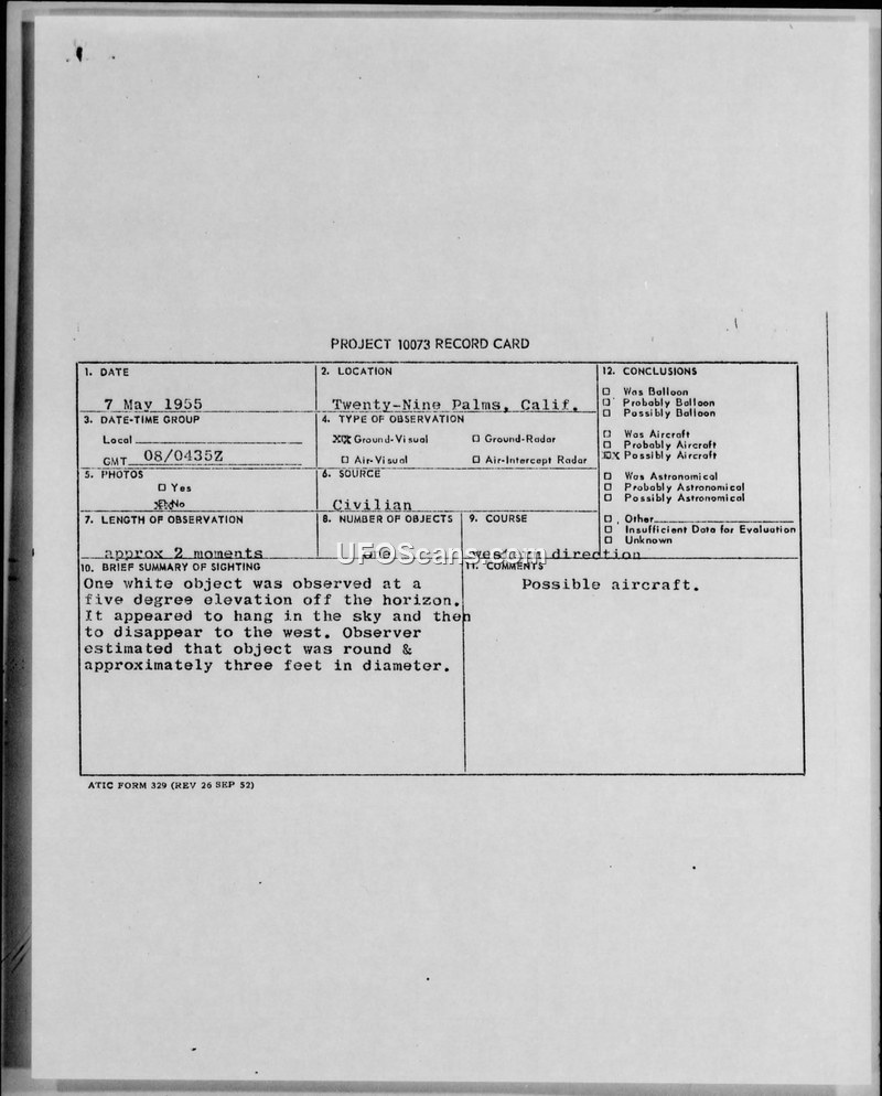 A civilian reported a small, white, round object in the sky over Twenty-Nine Palms, California, on May 7, 1955. Military intelligence evaluated the report and concluded it was possibly an aircraft.