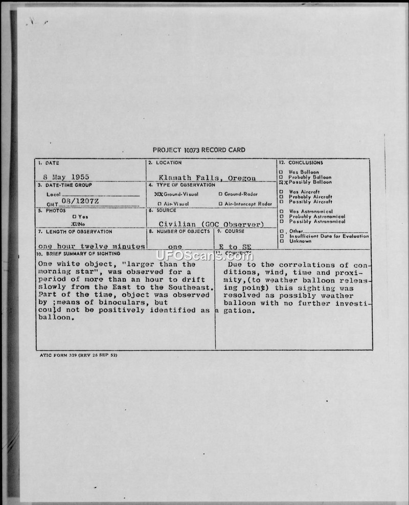A civilian observer in Klamath Falls, Oregon, reported a white object on May 8, 1955. The Air Technical Intelligence Center concluded it was likely a weather balloon based on wind and release point data.