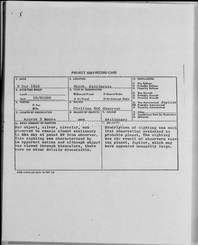 On May 9, 1955, a civilian Ground Observer Corps (GOC) observer named Ronald Nimmler reported a sighting in Ukiah, California. The witness observed a single, silver, circular object that remained stationary in the sky for approximately five hours. The object was located to the southwest of the observer's position. Despite the witness using binoculars to examine the object, no other details were discernible, and the object exhibited no apparent motion. The sighting was reported to the 28th Air Division. Following an evaluation of the report, the 28th Air Division concluded that the sighting was not an unidentified aerial phenomenon, but rather the planet Jupiter, which may have appeared unusually large to the observer. The report notes that other aircraft, specifically Western Flight 731 and United Flight 450, passed through the area and reported nothing unusual. Based on these findings, the 28th Air Division determined that no further investigation was required.